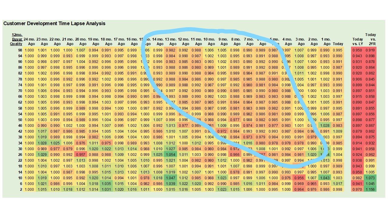 Do you see any green cells in the top 60% of the twelve-month buyer file? Just three months ago, that's about it.