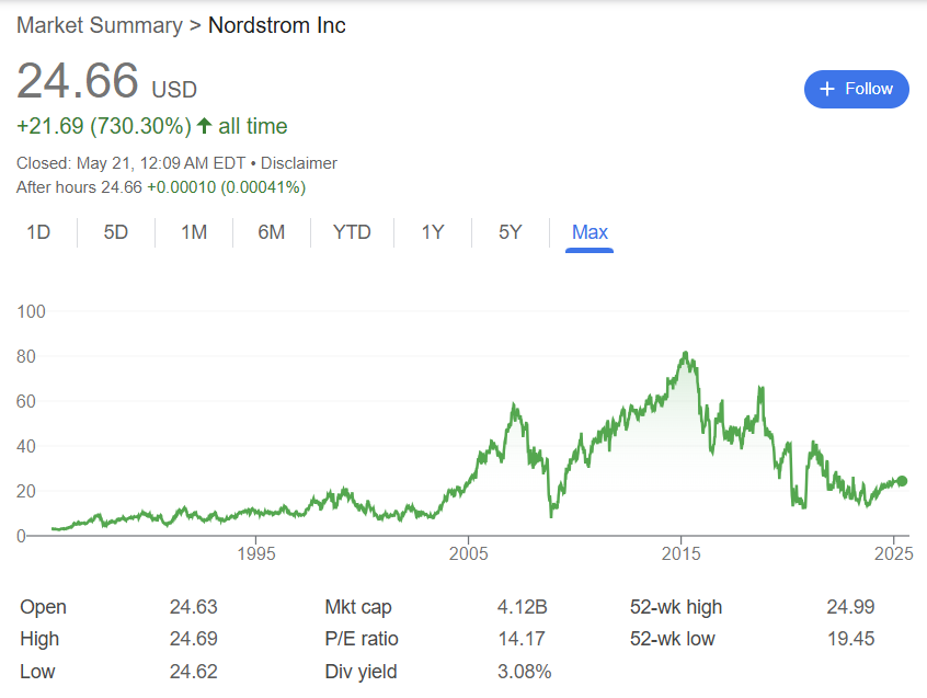 Nordstrom became a private company several weeks ago. I saved the multi-year trend of their stock price. What year was the peak of the "omnichannel era"?
